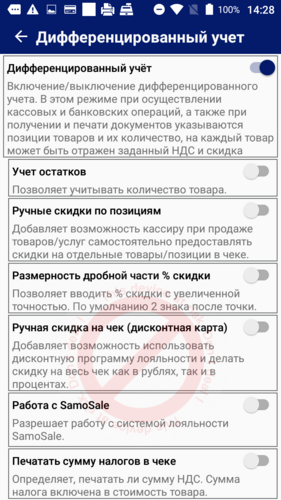 В режиме дифференцированного учёта используется товарная база. Указываются позиции товаров и их количество, на каждый товар может быть отражен заданный НДС и скидка. Если вы не используете товарную базу, то вам необходимо отключить настройку «Дифференцированный учет».