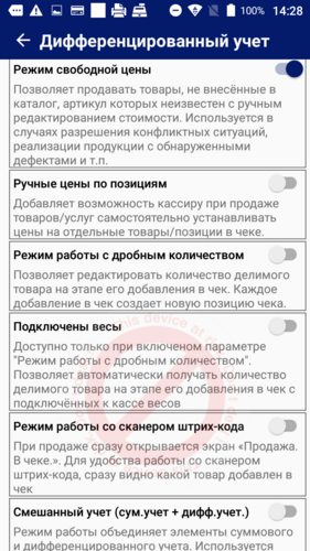 Режим работы объединяет элементы суммового и дифференцированного учета. Используется для эффективного управления продажами маркированных товаров совместно с продажей товаров по свободной цене.