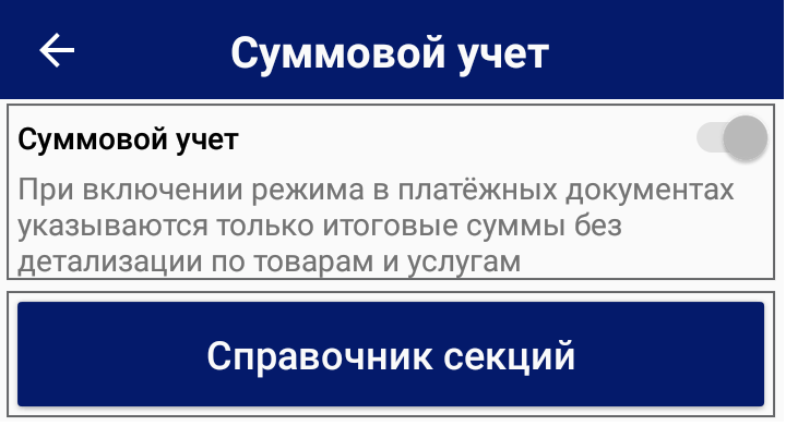 В режиме суммового учёта не используется товарная база. Скидки не используются. Для включения необходимо отключить «дифференцированный учет».