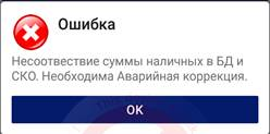 На экране «Аварийная коррекция» нажать кнопку «Скорректировать сумму». Отобразится сообщение «Расхождение наличных скорректировано успешно». В списке чеков отобразится чек Аварийной коррекции (не фискальный).