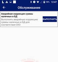 В списке функций «Обслуживание» в строке «Аварийная коррекция суммы наличных в БД» нажать «Выполнить».