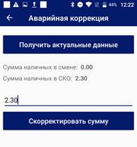 На экране «Аварийная коррекция» нажать кнопку «Получить актуальные данные». В строке расхождений отобразится сумма расхождения наличных. Кнопка «Скорректировать сумму» станет доступна.