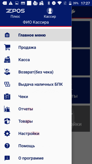 Содержит команды открытия экранов «Помощь», «О программе», «Получить данные», имя текущего пользователя и подключенный тариф.