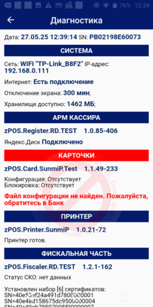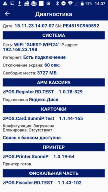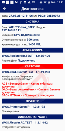 В меню Диагностика есть возможность узнать о состоянии подключения к сети Интернет, внешнего хранилища, внешней системы и др.