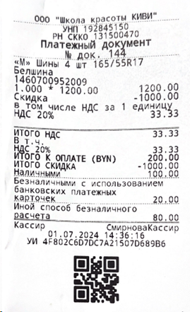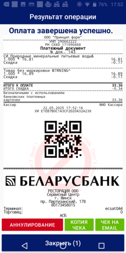 При успешном завершении продажи платёжный документ будет сформирован в электронном и бумажном виде и будет содержать: