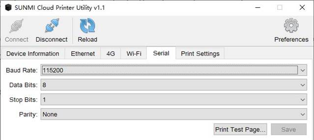 Нажмите кнопку «Печать тестовой страницы/Print Test Page», чтобы выполнить тестовую печать через последовательный порт.