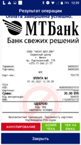 Терминальный чек будет сформирован в электронном и в 2-х бумажных экземплярах (для клиента и для банка) и будет содержать:
