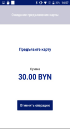 Если работаете со встроенным терминалом в едином цикле кассы и терминала, при полной или частичной оплате банковской картой появится экран ожидания предъявления банковской карты. Необходимо провести считывание банковской карты бесконтактным или контактным способом и дождаться завершения транзакции с банком.