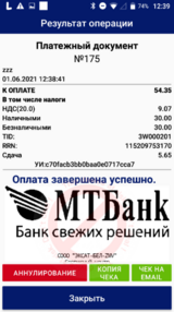 Должны быть напечатаны: платёжный документ (фискальный кассовый чек) и 2 экземпляра терминальных чеков.