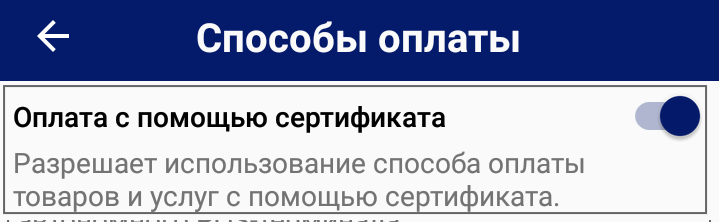 Оплата с помощью сертификата. Разрешает использование способа оплаты товаров и услуг с помощью сертификата. После включений данной настройки на экране выбора способа оплаты появиться новый способ «Сертификатом».
