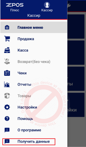 Для того что бы узнать Регистрационный номер программной кассы зайдите в боковое меню и нажмите кнопку «Получить данные».