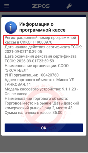 На экране отобразиться информация о программной кассе полученной с сервера ПКC оператора. В первой строке будет указан необходимый номер.