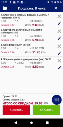 и откроется экран «Продажа. В чеке» с товарами, добавленными в чек.