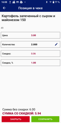На открывшемся экране «Позиция в чеке» измените необходимые параметры товара в чеке, нажмите в строке символ