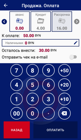 На экране «Продажа. Оплата» переданные в файле заказа сумма и наименование иных авансовых способов оплаты будут отображены серым цветом и недоступны для редактирования.