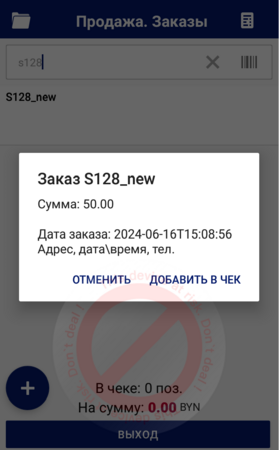 После нажатия на заказ будет отображено дополнительно окошко для ознакомления с данными заказа и предложением добавления в чек.