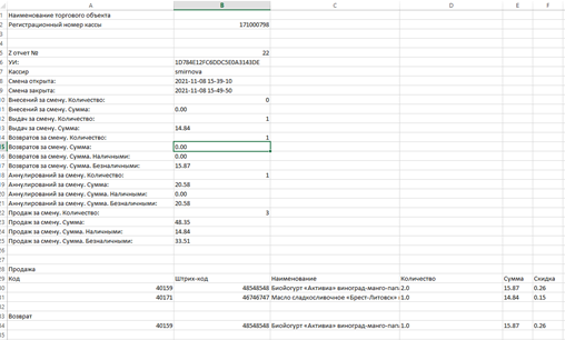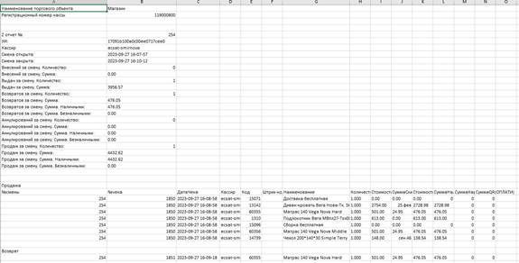 в отчете будут отображена детализация по продажам и возвратам за смену