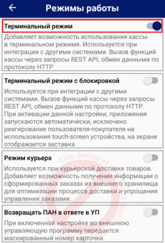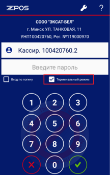 Для запуска режима необходимо установить чек-бокс «Терминальный режим" и авторизаваться пользователем кассир.