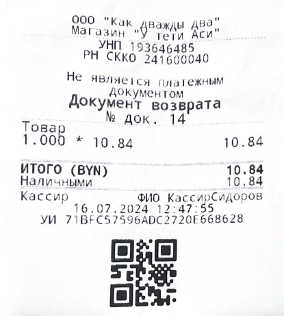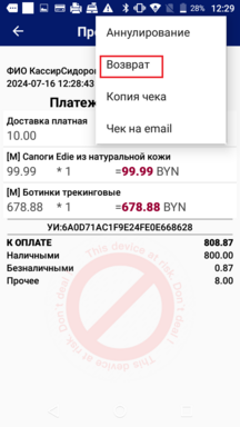 Нажмите кнопку «Возврат» для подтверждения операции. Будет распечатан чек возврата.