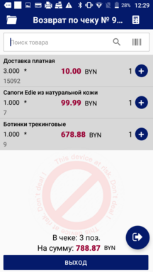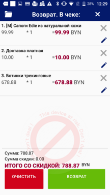 На экране «В чеке» измените нужные параметры товара: цену, количество и нажмите кнопку «Возврат» внизу экрана.