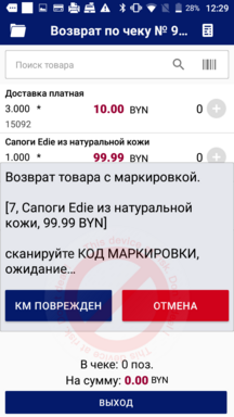 Если код маркировки поврежден, то необходимо нажать кнопку "КМ поврежден" и товар добавиться в чек возврата без кода маркировки.