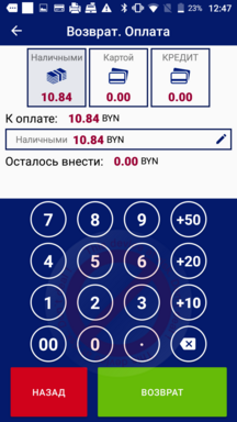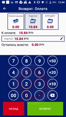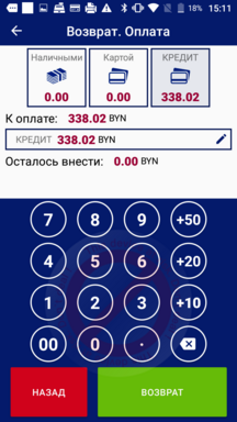 На появившемся экране «Возврат. Оплата» введите сумму возврата по карте. Для ввода суммы используйте цифровую клавиатуру. При вводе суммы возврата, превышающей сумму чека, отображается сообщение «Сумма возврата не должна превышать сумму чека».