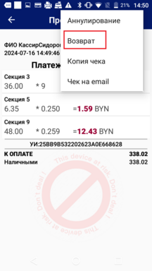 Нажмите кнопку «Возврат» для подтверждения операции. Будет распечатан чек возврата. Операция возврата денег по чеку в zPOS.АРМ Кассира выполнена.