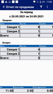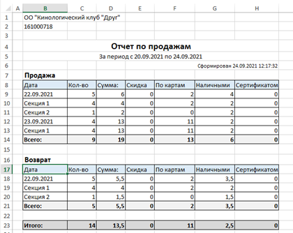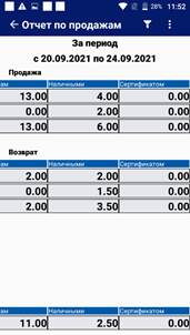 Отчёт содержит информацию о продажах и возвратах товаров с информацией по каждому типу оплат за определённый период.